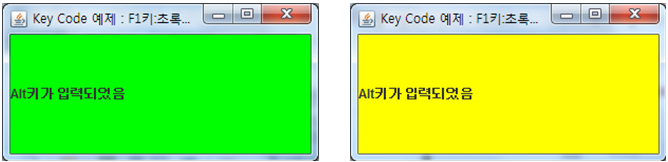 if(e.getKeyChar() == '%') // 입력된 키가 % 인 경우 contentPane.setBackground(Color.YELLOW); else if(e.getKeyCode() == KeyEvent.VK_F1) // 입력된 키가 <F1> 인가 contentPane.setBackground(Color.GREEN); } }