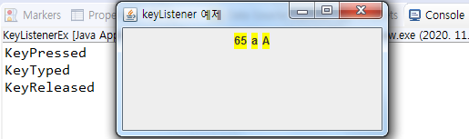 // la에 입력된 키의 키 이름 문자열을 출력하여 사용자에게 보고함 la.setText(KeyEvent.getKeyText(e.getKeyCode())+"키가 입력되었음");