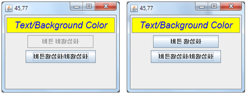 JButton b1 = new JButton("Text/Background Color"); JButton b2 = new JButton(" 비활성화버튼 "); JButton b3 = new JButton("버튼활성화/비활성화");