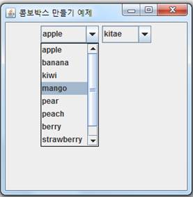 public class ComboBoxEx extends JFrame { private String [] fruits = {"apple", "banana", "kiwi", "mango", "pear", "peach", "berry", "strawberry", "blackberry"}; private String [] names = {"kitae", "jaemoon", "hyosoo", "namyun"};