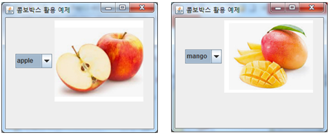 public class ComboActionEx extends JFrame { private String [] fruits = {"apple", "banana", "kiwi", "mango"}; // 콤보박스의 아이템 private ImageIcon [] images = { // 이미지 객체 배열 new ImageIcon("images/apple.jpg"), new ImageIcon("images/banana.jpg"), new ImageIcon("images/kiwi.jpg"), new ImageIcon("images/mango.jpg")}; private JLabel imgLabel = new JLabel(images[0]); // 이미지 레이블 컴포넌트 private JComboBox<String> strCombo = new JComboBox<String>(fruits); // 문자열 콤보박스