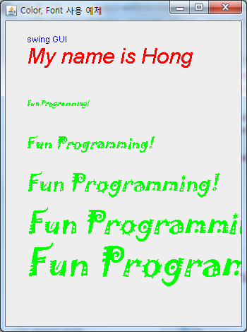 class MyPanel extends JPanel { public void paintComponent(Graphics g) { super.paintComponent(g); g.setColor(Color.BLUE); // 파란색 선택 g.drawString("swing GUI", 30,30); // (30,30) 위치에 문자열 출력 g.setColor(new Color(255, 0, 0)); // 빨간색 선택 g.setFont(new Font("Arial", Font.ITALIC, 30)); // Arial 폰트 선택 g.drawString("My name is Hong", 30, 60); // (30,60) 위치에 문자열 출력 g.setColor(new Color(0x00ff00)); // 빨간색과 파란색을 섞은 색 선택 for(int i=1; i<=5; i++) { g.setFont(new Font("Jokerman", Font.ITALIC, i*10)); g.drawString("Fun Programming!", 30, 60+i*60); } } }