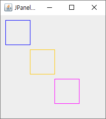 class MyPanel extends JPanel { public void paintComponent(Graphics g) { super.paintComponent(g); // JPanel의 paintComponent() 호출 g.setColor(Color.BLUE); // 파란색 선택 g.drawRect(10,10,50,50); // (10,10) 위치에 50x50 크기의 사각형 그리기 g.drawRect(60,70,50,50); // (60,70) 위치에 50x50 크기의 사각형 그리기 g.drawRect(110,130,50,50); // (110,130) 위치에 50x50 크기의 사각형 그리기 } } |