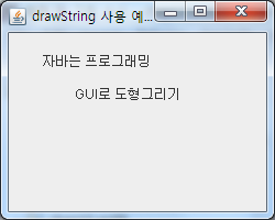 // JPanel을 상속받는 새 패널 작성 class MyPanel extends JPanel { public void paintComponent(Graphics g) { super.paintComponent(g); g.drawString("자바 프로그래밍", 30,30); // 패널의 (30,30) 위치에 문자열 출력 g.drawString("GUI로 도형그리기", 60, 60); // 패널의 (60,60) 위치에 문자열 출력 } }