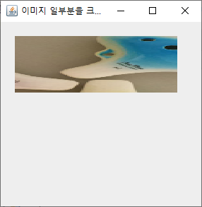 // 이미지의 (100,50)에서 (200,200)의 영역을 패널상의 (20,20)에서 (250,100) 의 영역으로 확장하여 그린다. g.drawImage(img, 20, 20, 250, 100, 100, 50, 200, 200, this); } }