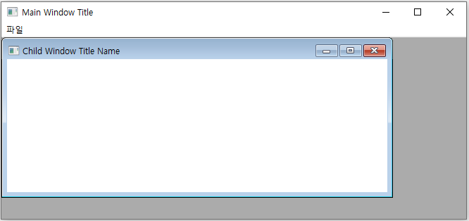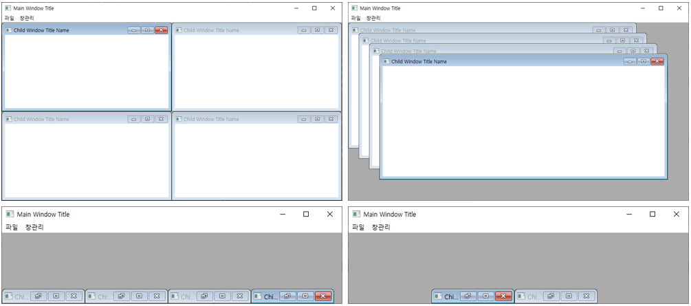 switch (iMsg) { case WM_CREATE: clientcreate.hWindowMenu = GetSubMenu(GetMenu(hwnd), 0); clientcreate.idFirstChild = 100; hwndClient = CreateWindow( _T("MDICLIENT"), NULL, WS_CHILD | WS_CLIPCHILDREN | WS_VISIBLE, 0, 0, 0, 0, hwnd, NULL, hInst, (LPSTR)&clientcreate ); ShowWindow(hwndClient, SW_SHOW); return 0; case WM_COMMAND: switch (LOWORD(wParam)) { case ID_FILENEW: mdicreate.szClass = _T("Child Window Class Name"); mdicreate.szTitle = _T("Child Window Title Name"); mdicreate.hOwner = hInst; mdicreate.x = CW_USEDEFAULT; mdicreate.y = CW_USEDEFAULT; mdicreate.cx = CW_USEDEFAULT; mdicreate.cy = CW_USEDEFAULT; mdicreate.style = 0; mdicreate.lParam = 0; hwndChild = (HWND)SendMessage(hwndClient, WM_MDICREATE, 0, return 0; } break; case WM_DESTROY: PostQuitMessage(0); return 0; } return DefFrameProc(hwnd, hwndClient, iMsg, wParam, lParam); }