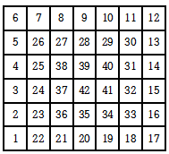 아래 그림은 7 × 6 공연장에서 대기번호 1번부터 42번까지의 관객이 좌석에 배정된 결과를 보여주고 있다.