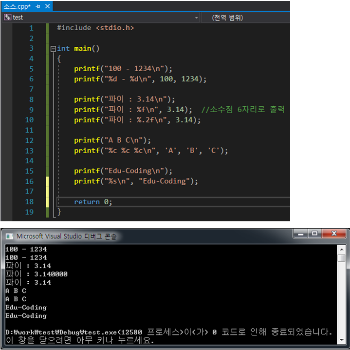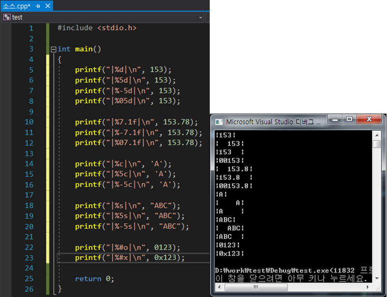 지금까지 printf()함수를 사용하기 위해 필요한 할 것들을 알아 보았습니다. 지금 부터 예제를 통해 실습해 보겠습니다.
