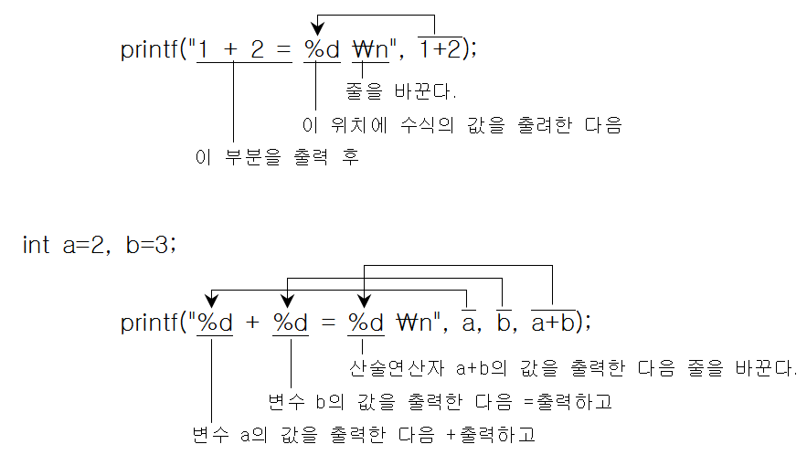 printf("%문자 및 문자열", 인자1, 인자2, ...) |