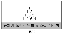 파스칼 삼각형이란 아래 <표1> 과 같은 자신의 왼쪽 위의 좌표와 오른쪽 위의 좌표 값을 더해서 값을 계속 갱신해 나가는 형태의 삼각형을 말한다.