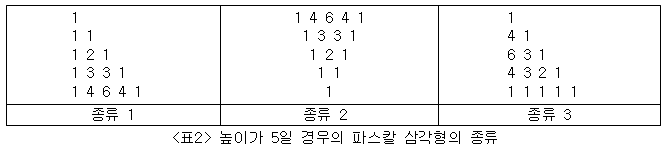 m에 대한 파스칼 삼각형의 모습은 아래 <표2>의 모습과 같다.