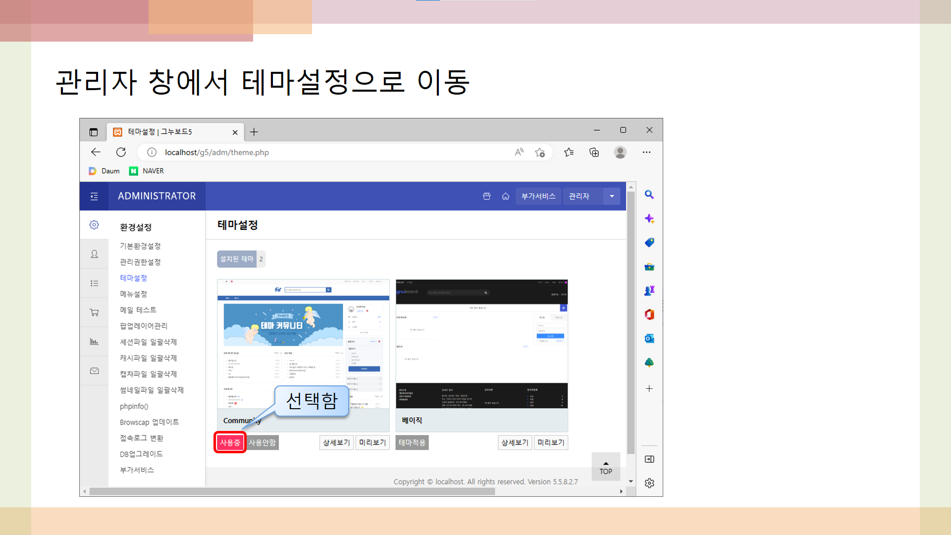 관리자 창에서 "테마설정"버튼을 클릭하고 테마를 선택하고 적용한다.