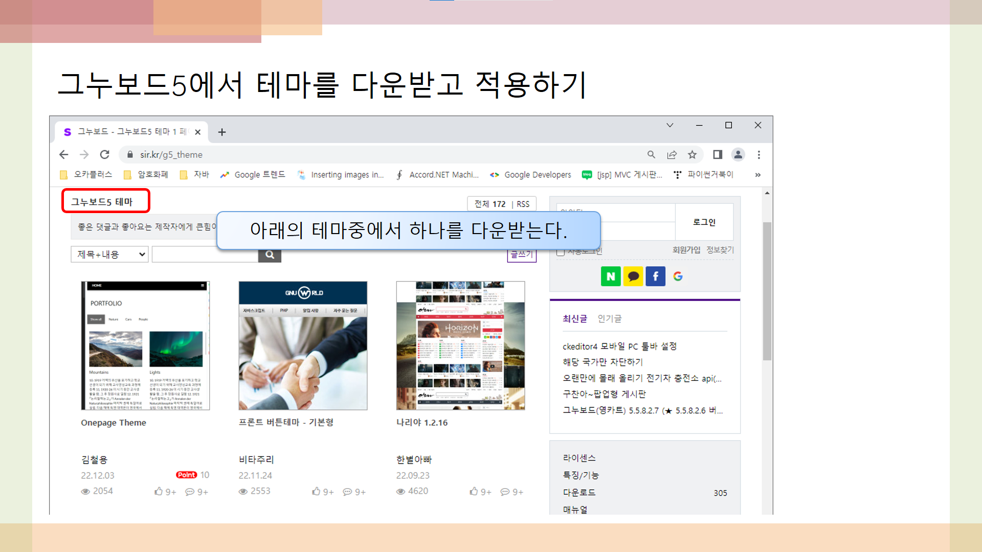관리자 창에서 "테마설정"버튼을 클릭하고 테마를 선택하고 적용한다.