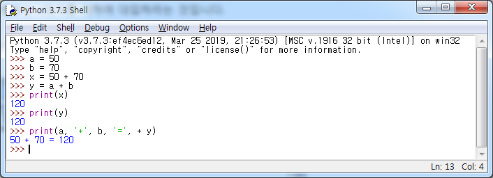 print()함수로 출력한 결과 값이 50 + 70 = 120이 나왔습니다. 코드를 잘 보시면 여러개의 값을 출력하기 위해 콤마(,)로 구분하여 모든 내용을 출력하는 것을 알 수 있습니다.