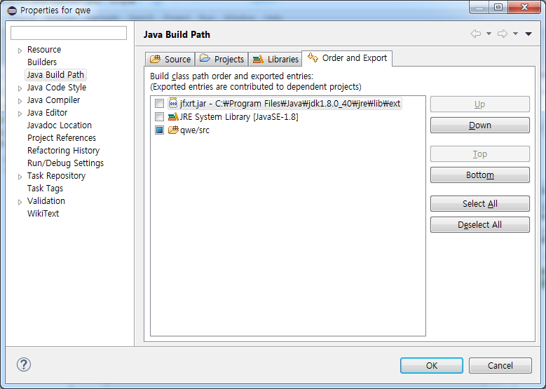 2. 프로젝트 속성창에서 Order and Export 탭을 선택
