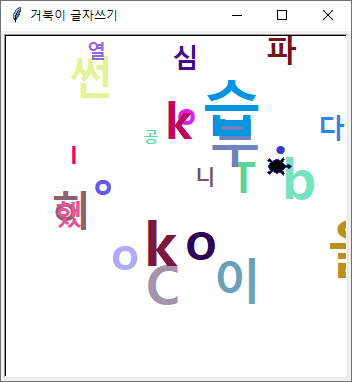 터틀 그래픽에서 문자열을 입력받고, 입력받은 문자열을 한 글자씩 임의의 크기와 색상으로 임의의 위치에 거북이가 쓰는 프로그램이다. askstring()함수로 문자열을 입력받는다.