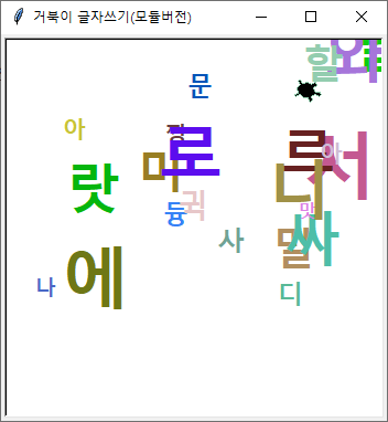 [프로그램2]에서 만든 임의의 위치에 글자를 쓰는 거북이와 기능이 같다. 하지만 임의의 위치, 색상, 글자 크기 등의 함수를 사용해 추출하고 앞에서 배운 모듈로 작성할 것이다.