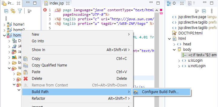 1. 프로젝트명에서 마우스 오른쪽버튼 클릭하고 [Build Path] - [Configure Build Path..] 클릭