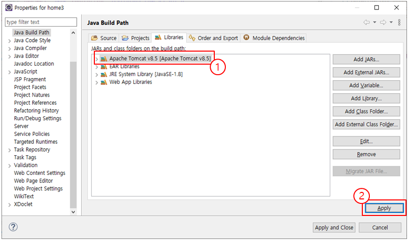 5. Libraries에 톰캣서버가 추가되어 있는 것을 확인한 다음 [Apply] 버튼을 클릭하면 에러가 해결된다.