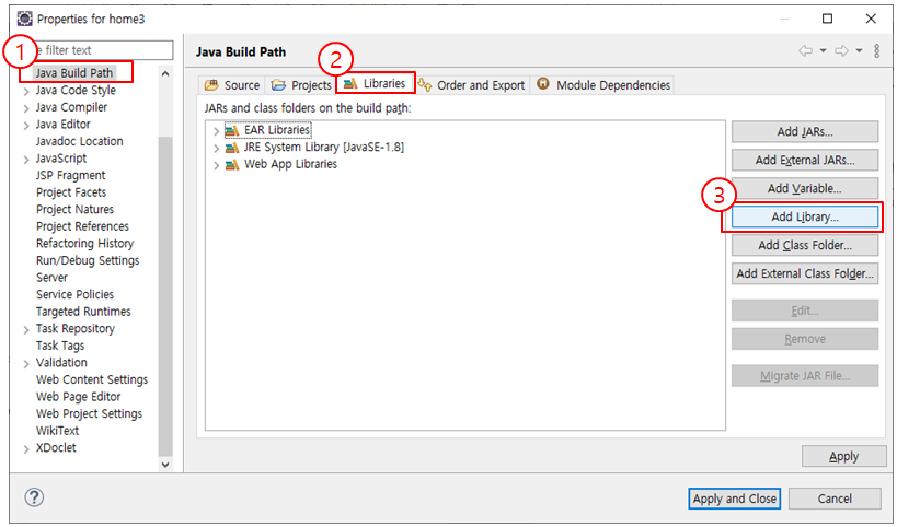 2. Properties에서 [Java Build Path] - [Libraries] - [Add Library...] 을 클릭
