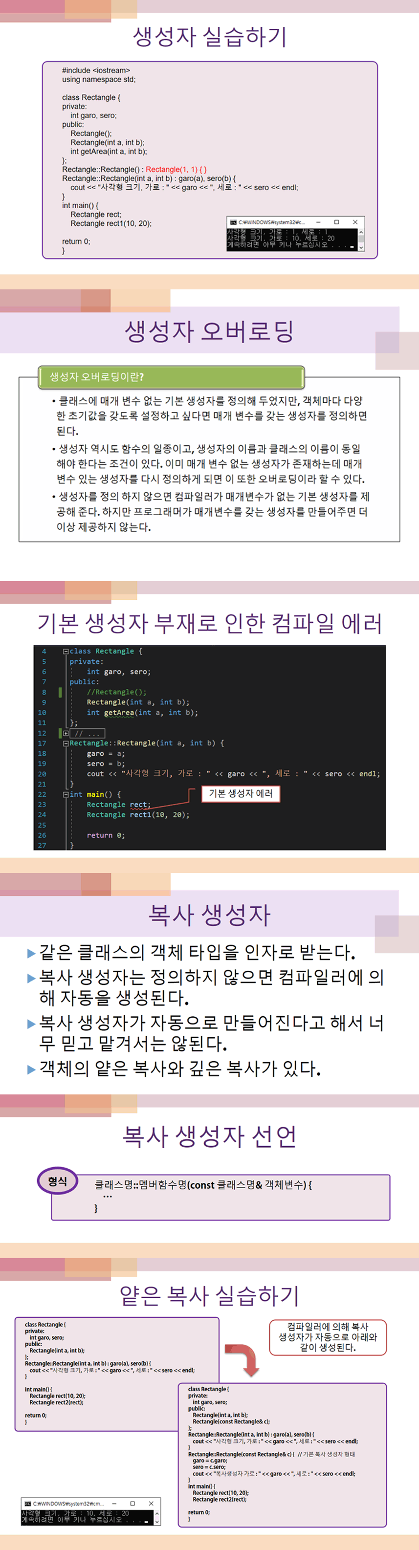 class 클래스명 { private: 멤버 변수; public: 멤버 함수(); }; 클래스명::멤버 함수() { 명령어 처리 } |