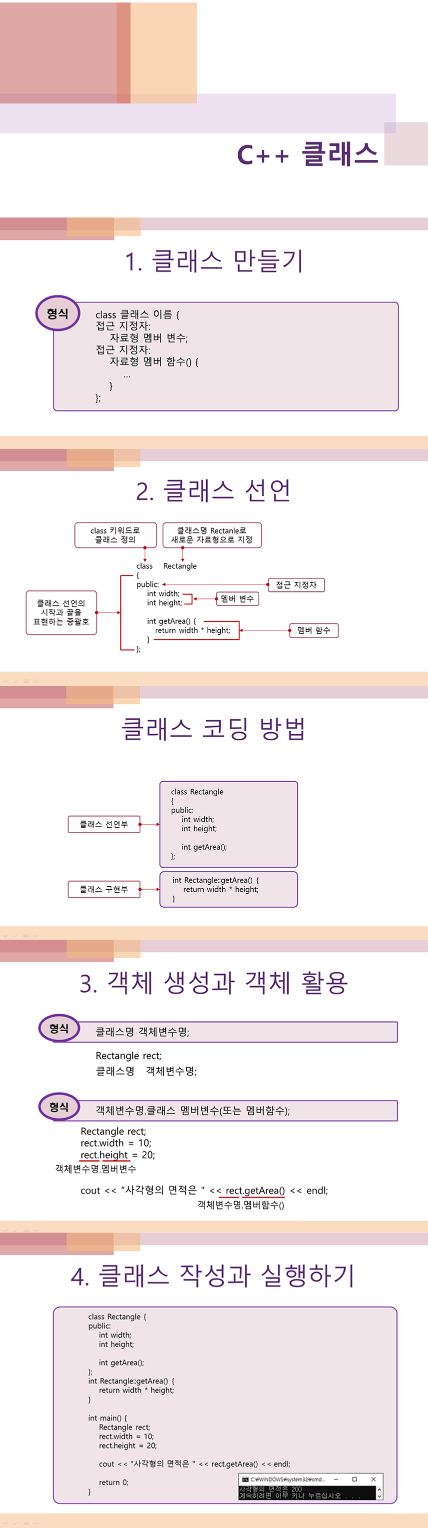 - 클래스 선언은 클래스 명세라고도 하며 예약어 class와 사용자 타입 이름을 적은 다음 몸통부를 중괄호({ })를 사용하여 묶는다. 다든 중괄호(}) 뒤엔 세미콜론(;)이 있어야 한다. 중괄호 사이에는 접근 권한에 대한 예약어(public, private, protected)를 사용할 수 있다. 접근 권한 예약어 뒤엔 콜론(:)을 붙여 명시한다. 중괄호 사이에는 공개, 비공개, 보호영역이 존재할 수 있으며, 영역에 따른 다음과 같이 구분할 수 있다. 각 영역은 데이터 멤버와 멤버 함수를 가질 수 있다. 멤버 함수는 명세 내부에서 직접 정의 할 수도 있고 또 클래스 명세 내부에서 함수 원형만 선언하고 클래스 명세 밖에서 정의할 수도 있다.