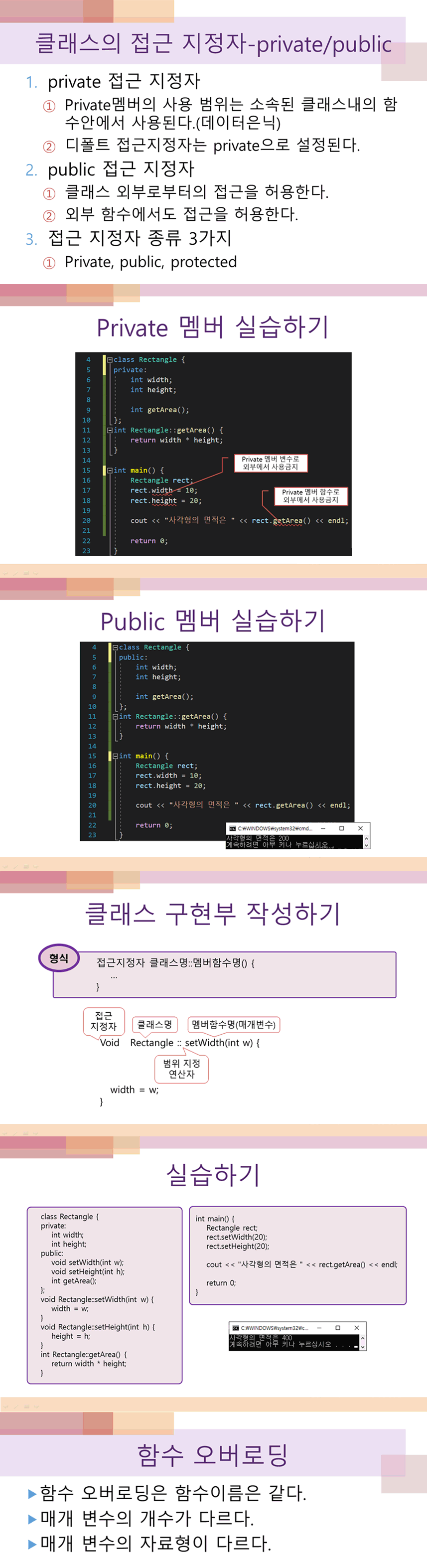private : 멤버변수나 멤버함수가 private로 선언되면 클래스 내의 멤버함수 속에서만 사용할 수 있다. (단 friend로 지정된 함수와 friend로 지정된 클래스에서는 private으로 지정된 멤버에도 접근할 수 있다.)