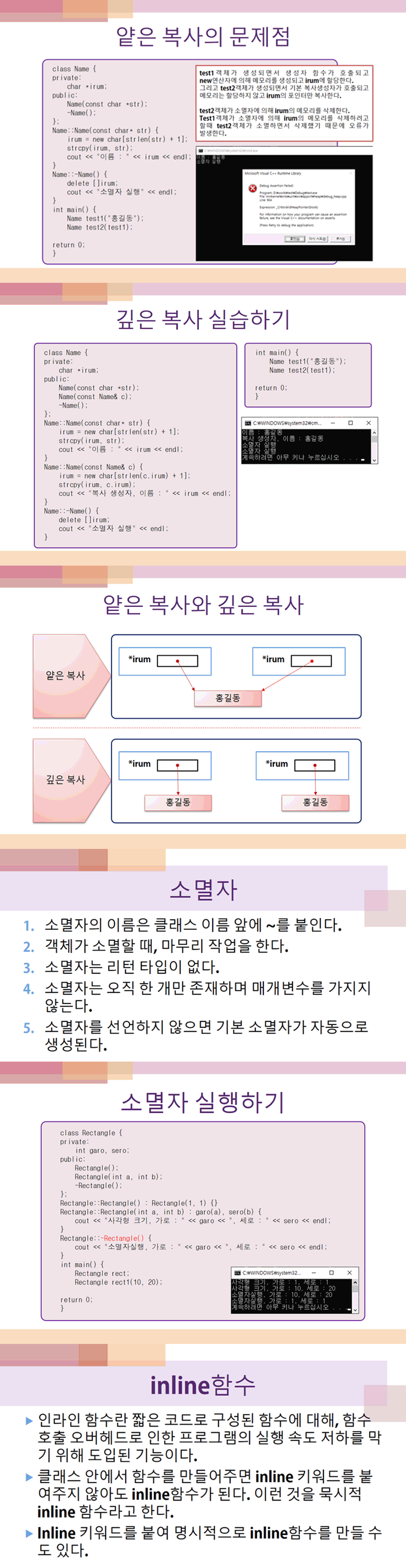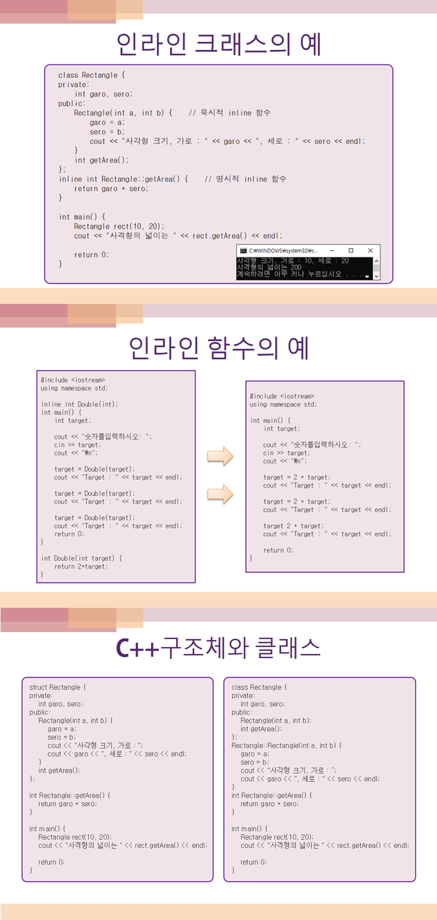 클래스 안에서 멤버함수의 프로토타입만 기재하고 실제 멤버함수의 내용을 클래스 밖에서 작성하면서 그 멤버함수를 인라인 함수로 만들려면 함수명 앞에 inline이라는 키워드를 입력하면 된다.