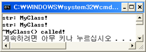 | #include <iostream> using namespace std; class MyClass { private: char* str; public: MyClass(const char* aStr) { str = new char[strlen(aStr) + 1]; strcpy(str, aStr); } ~MyClass() { delete[]str; cout << "~MyClass() called!" << endl; } void ShowData() { cout << "str: " << str << endl; } }; int main() { MyClass mc1("MyClass!"); MyClass mc2 = mc1; mc1.ShowData(); mc2.ShowData(); return 0; } 실행 결과 ![]() 에러 발생 |