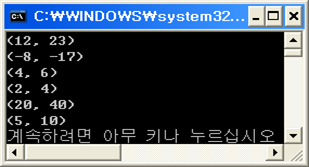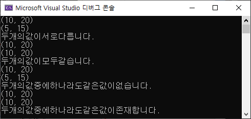 int main() { Point p1(10, 20), p2(5,15), p3(10, 20); if(p1==p2){ p1.Show(); p2.Show(); cout << "두개의값이모두같습니다." << endl; } else { p1.Show(); p2.Show(); cout << "두개의값이서로다릅니다." << endl; } if(p1==p3) { p1.Show(); p3.Show(); cout << "두개의값이모두같습니다." << endl; } else { p1.Show(); p3.Show(); cout << "두개의값이서로다릅니다." << endl; } if(p1!=p2) { p1.Show(); p2.Show(); cout << "두개의값중에하나라도같은값이없습니다."<< endl; } else { p1.Show(); p2.Show(); cout << "두개의값중에하나라도같은값이존재합니다.”<< endl; } if(p1!=p3) { p1.Show(); p3.Show(); cout << "두개의값중에하나라도같은값이없습니다."<< endl; } else { p1.Show(); p3.Show(); cout << "두개의값중에하나라도같은값이존재합니다."<< endl; } return 0; } |