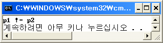 bool Point::operator==(const Point &pt) const { return (x == pt.x && y == pt.y); // x, y가 모두 같으면 true } bool Point::operator!=(const Point &pt) const { return (x != pt.x || y != pt.y); // x, y 중 하나라도 다르면 true } int main(void) { Point p1(10, 20), p2(20, 30); if(p1 == p2) cout << "p1 == p2" << endl; else cout << "p1 != p2" << endl; return 0; } ![]()