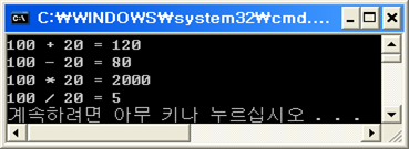 int main() { add a, b; a.set(100); b.set(20); cout << "100 + 20 = " << (a+b) << endl; cout << "100 - 20 = " << (a-b) << endl; cout << "100 * 20 = " << (a*b) << endl; cout << "100 / 20 = " << (a/b) << endl; return 0; } ![]()