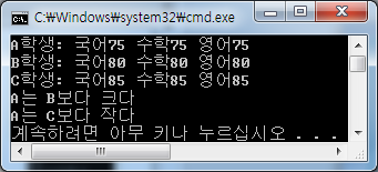cout<< "A학생: "; a.outstudent(); cout<< "B학생: "; b.outstudent(); cout<< "C학생: "; c.outstudent(); if(a>b) cout << "A는 B보다 크다" << endl; else cout << "A는 B보다 작거나 같다." << endl; if(a>=c) cout << "A는 C보다 크거나 같다." << endl; else cout << "A는 C보다 작다" << endl; } ![]()