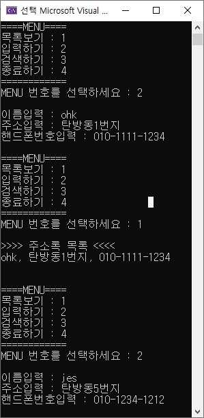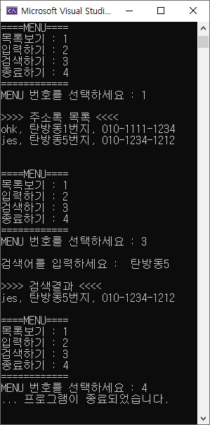 while (myAddress.checkQuit() != 1) // 종료조건이아닌경우반복합니다 { myAddress.seletMenu(); // 사용자가enu를선택하도록합니다 myAddress.inputPN(); // 사용자가선택한enu에따라처리합니다 } return 0; } |