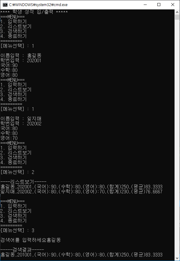 #include <iostream> #include <fstream> using namespace std; class student { private: char num[5]; int quit; int kor, math, eng; int sum; double avg; public: void intro(); // 시작화면 함수 void menu(); // 메뉴항목을 보여주는함수 void select(); // 메뉴 번호를 입력받는 함수 void write(); // 입력받아 파일에 저장하는 함수 void showlist(); // 파일에서 읽어와 보여주는 함수 void search(); // 검색하는 함수 int checkQuit(); // quit값을 읽는 함수 void processquit(); // 프로그램 종료 함수 void score(); // 과목입력과 합계/평균구하는 함수 }; void student::intro() { cout << "**** 학생 성적 입/출력 *****" << endl; } void student::menu() { cout << "===MENU===" << endl; cout << "1. 입력하기" << endl; cout << "2. 리스트보기" << endl; cout << "3. 검색하기" << endl; cout << "4. 종료하기" << endl; cout << "=========" << endl; } void student::select() { cout << "[메뉴선택] : "; cin.getline(num, sizeof(num)); while ((atoi(num) != 1) && (atoi(num) != 2) && (atoi(num) != 3) && (atoi(num) != 4)) { cin.getline(num, sizeof(num)); } if (atoi(num) == 1) write(); else if (atoi(num) == 2) showlist(); else if (atoi(num) == 3) search(); else if (atoi(num) == 4) processquit(); } void student::write() { ofstream wAddress("list.txt", ios::out|ios::app); if (!wAddress) { cout << "파일을 열 수 없습니다.\n"; quit = 1; } else { char name[10]; char stdnum[10];