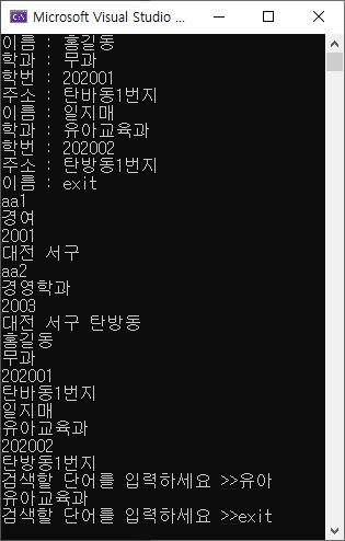 while (true) { cout << "검색할단어를입력하세요>" string word; getline(cin, word); if (word == "exit") { break; } /* 단어검색/ for (int i = 0; i < wordVector.size(); i++) { int index = wordVector[i].find(word); if (index != -1) { cout << wordVector[i] << endl; } } } }