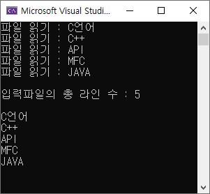 /* 파일에서한글자씩of일때까지읽기/ /* int c = 0; while ((c = fin.get()) != -1) { cout << (char)c; } */ /* 파일에서한줄씩of일때까지읽기/ char buf[100]; while (true) { fin.getline(buf, 100); if (fin.eof()) { break; } cout << buf << endl; } /* 파일닫기/ fin.close(); } |