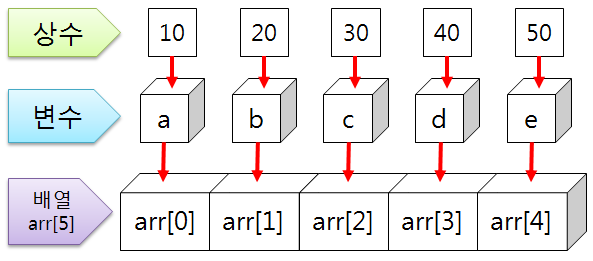 지금까지 변수를 선언할 때 int a, b, c, d, e 이런 방식으로 선언 했습니다. 지금 5개의 정수형 변수를 선언 했는데 이런 정수형 변수가 10개, 20개, 100개 라면 변수를 하나 하난 선언한다는게 어렵습니다. 그래서 배열 이란는 것이 있습니다. 정수형 변수 10개를 선언하라고 하면 int arr[10]으로 선언하면 끝입니다. 머 100개를 선언하라고 하면 int arr[100] 이라고 선언하면 됩니다. 아주 간단하게 끝났습니다.