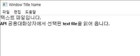 #include<stdio.h> { FILE *fPtr; HDC hdc; int line; TCHAR buffer[500]; line = 0; hdc = GetDC(hwnd); #ifdef _UNICODE _tfopen_s(&fPtr, filename, _T("r, ccs = UNICODE")); // 유니코드로 파일 열기 #else _tfopen_s(&fPtr, filename, _T("r")); #endif while (_fgetts(buffer, 100, fPtr) != NULL) // 줄 단위로 텍스트 파일 읽어오는 함수 { if (buffer[_tcslen(buffer) - 1] == _T('\n')) buffer[_tcslen(buffer) - 1] = NULL; TextOut(hdc, 0, line * 20, buffer, _tcslen(buffer)); line++; } fclose(fPtr); ReleaseDC(hwnd, hdc); }