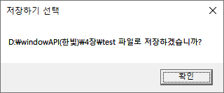 LRESULT CALLBACK WndProc(HWND hwnd, UINT iMsg, WPARAM wParam, LPARAM lParam) { OPENFILENAME OFN; OPENFILENAME OFN; TCHAR lpstrFile[100] = _T(""); TCHAR filter[] = _T("Every File(*.*) \0*.*\0") _T("Text File\0*.txt;*.doc\0"); switch (iMsg) { case WM_CREATE: break; case WM_COMMAND: switch (LOWORD(wParam)) { case ID_FILESAVE: memset(&SFN, 0, sizeof(OPENFILENAME)); SFN.lStructSize = sizeof(OPENFILENAME); SFN.hwndOwner = hwnd; SFN.lpstrFilter = filter; SFN.lpstrFile = lpstrFile; // 파일 경로 SFN.nMaxFile = 256; SFN.lpstrInitialDir = _T("."); if (GetSaveFileName(&SFN) != 0) // 다른이름으로 저장하기 대화상자 열기 { _stprintf_s(str, _T("%s 파일로저장하겠습니까), SFN.lpstrFile); MessageBox(hwnd, str, _T("저장하기선택"), MB_OK); } break; case ID_FILEOPEN: memset(&OFN, 0, sizeof(OPENFILENAME)); OFN.lStructSize = sizeof(OPENFILENAME); OFN.hwndOwner = hwnd; OFN.lpstrFilter = filter; OFN.lpstrFile = lpstrFile; OFN.nMaxFile = 256; OFN.lpstrInitialDir = _T("."); if (GetOpenFileName(&OFN) != 0) OutFromFile(OFN.lpstrFile, hwnd); break; } break; case WM_DESTROY: PostQuitMessage(0); break; } return DefWindowProc(hwnd, iMsg, wParam, lParam); }